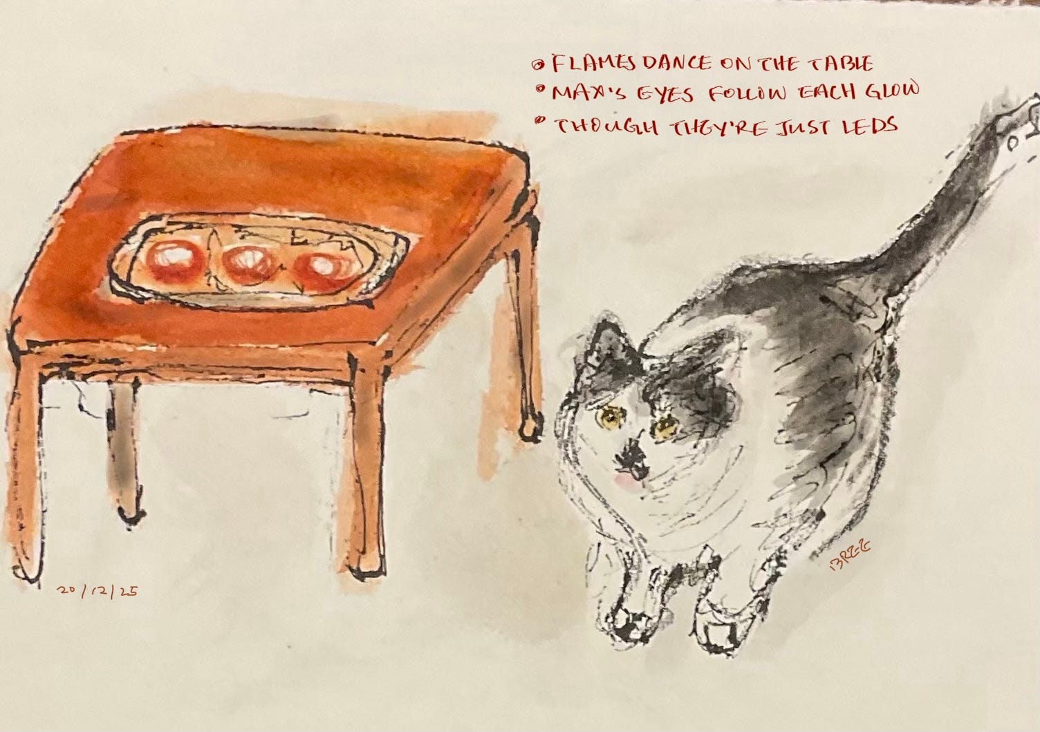 The next day, I replaced the candles with LED “candle” lights. I stepped away after turning them on, and when I returned, Max was on the table, carefully examining each one, one by one. The warm, flickering glow seemed to hold his curiosity just as firmly as the real flames had.