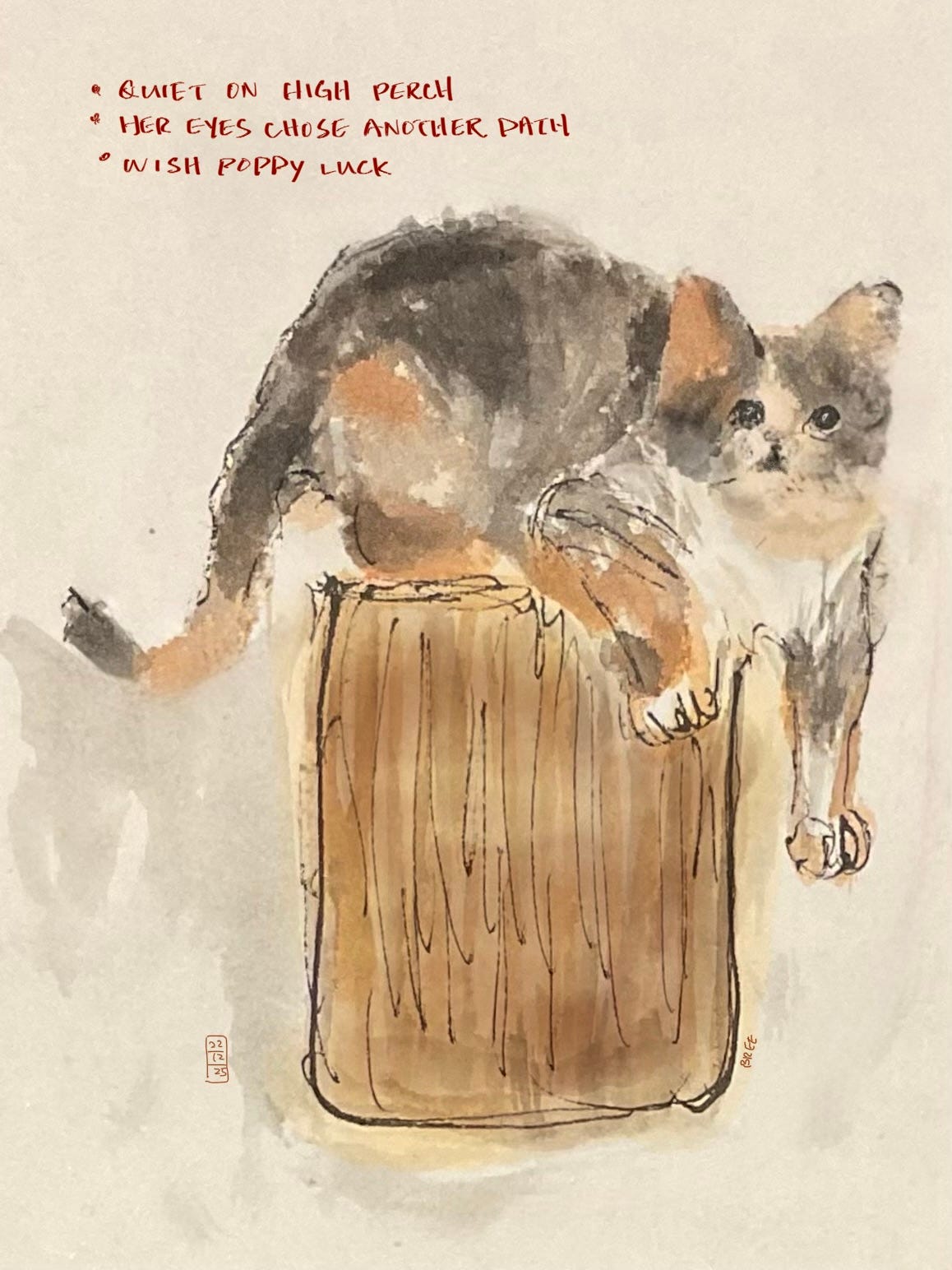 Poppy is a three-year-old calico, a shy sweet girl who would likely blossom in a calm, patient home with an adult cat. The shelter felt our family could be a good match. As I always do, I wore a sweater Max loves, hoping his scent would help introduce both of us to her.